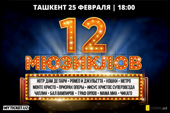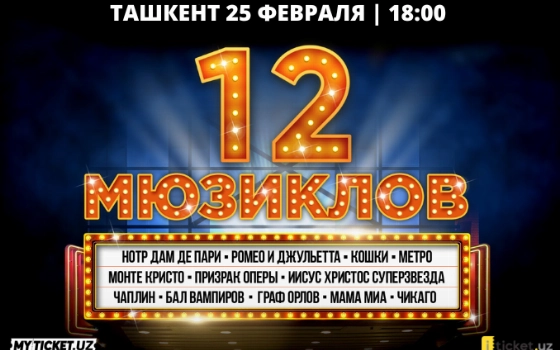 «12 мюзиклов» можно сравнить с удивительным музыкальным путешествием по страницам популярнейших мировых мюзиклов. Любимые артисты, перевоплощаясь из одного образа в другой, порадуют безупречным вокалом и отточенной пластикой. Шикарные костюмы и эффектные акробатические номера в сочетании с видеоинсталляцией, меняющей декорации, позволят зрителям легко перемещаться из одной локации в другую: из подземелья парижской оперы 一 на улицы Чикаго, а затем и в «танцующий Болливуд».