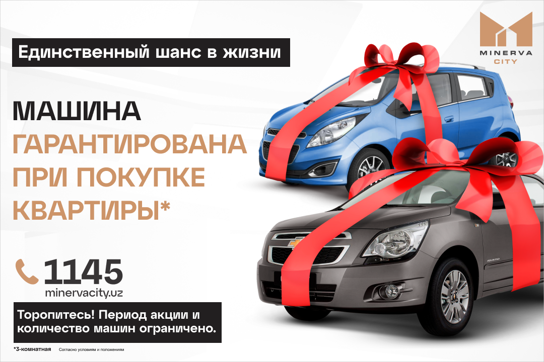 Minerva City рады представить акцию «2 ключа за 1», в рамках которой, вы можете приобрести 3-х комнатную квартиру в жилом комплексе и гарантированно получить автомобиль! Выбирая одну из двух типов 3-х комнатных квартир, вы получаете автомобиль марки Spark или Cobalt в подарок.