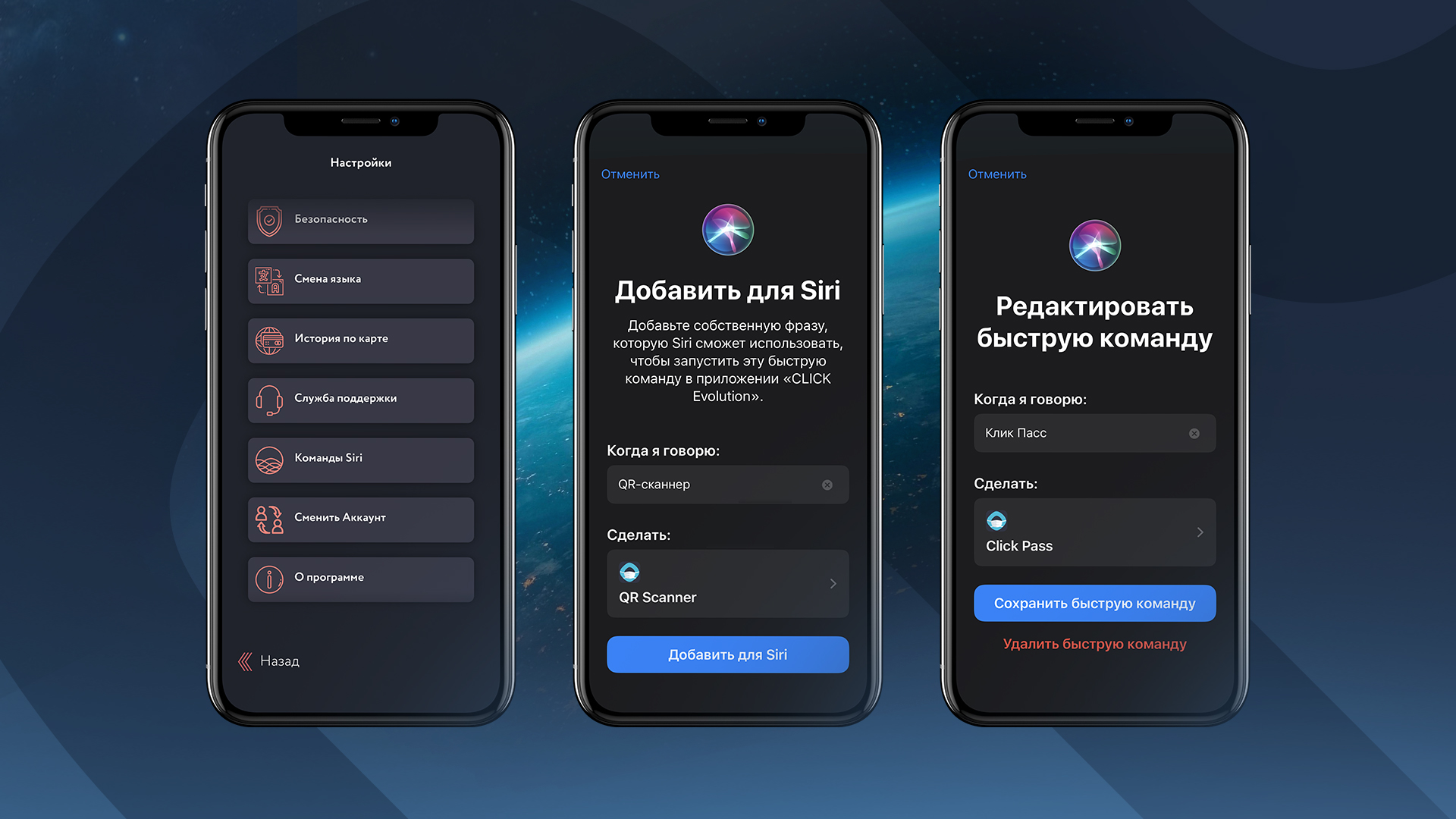 1. Интеграция с Siri. Теперь можно обратиться к Siri заданными командами, и она поможет открыть необходимый раздел в приложении - "Оплата", "Переводы", "CLICK PASS", "QR-Сканер". Или в настройках можно назначить любое другое название для вызова.