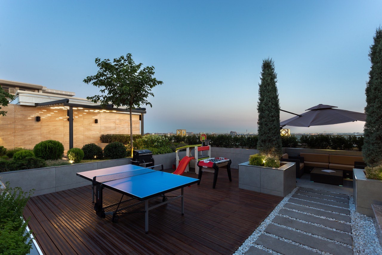 Самая большая зона приватной террасы, на которой можно разместить теннисный стол, детскую площадку, организовать зону барбекю. Если вы ведёте активный образ жизни, данная зона идеально подойдёт для занятий йогой под открытым небом или для занятий на беговой дорожке с панорамным видом на столицу.