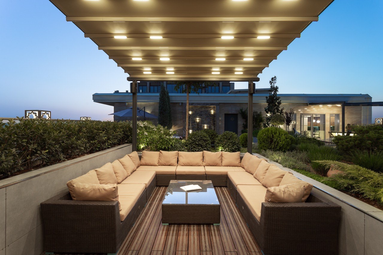 Кинотеатр на свежем воздухе может разместить большую компанию для просмотра фильма или игр на приставке. Автоматический навес, управляющийся по желанию владельца, позволит укрыться от солнца или дождя.