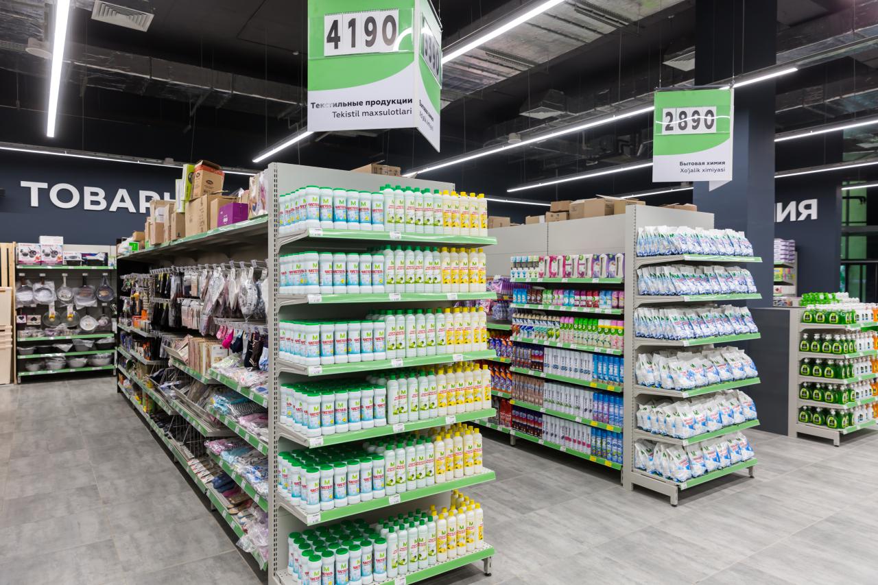 Общая площадь данного филиала составляет 1635 кв.м, а размер торговой площади свыше 1400 кв. м. В формате применено новое решение торговых оборудований: при входе использованы полки 1.4 метра – ниже уровня глаз, чтобы сориентироваться по периметру. Далее установлены классические полки высотой 2.2 м.