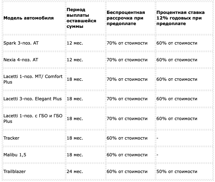 Оплатите первоначальный взнос понравившейся вам модели автомобиля согласно данной таблице и получите возможность выплачивать оставшуюся сумму без процентов или с годовой ставкой 12% в указанный срок.