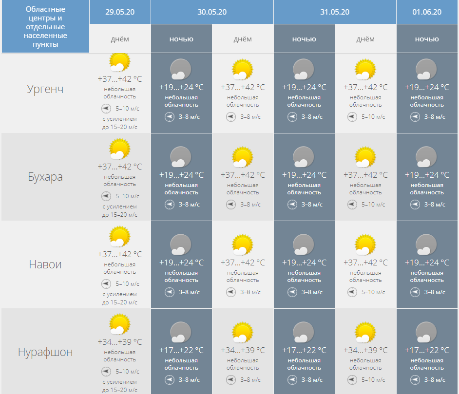 В Каракалпакстане и Хорезмской области небольшая, местами переменная облачность, без осадков. Ветер восточный 7-12 м/с, местами возможно усиление до 17-22 м/с. Температура ночью 19-24 тепла, днем 37-42 тепла. В Бухарской и Навоийской областях небольшая, местами переменная облачность, без осадков. Ветер восточный 7-12 м/с, местами возможно усиление до 17-22 м/с. Температура ночью 19-24 тепла, днем 37-42 тепла.