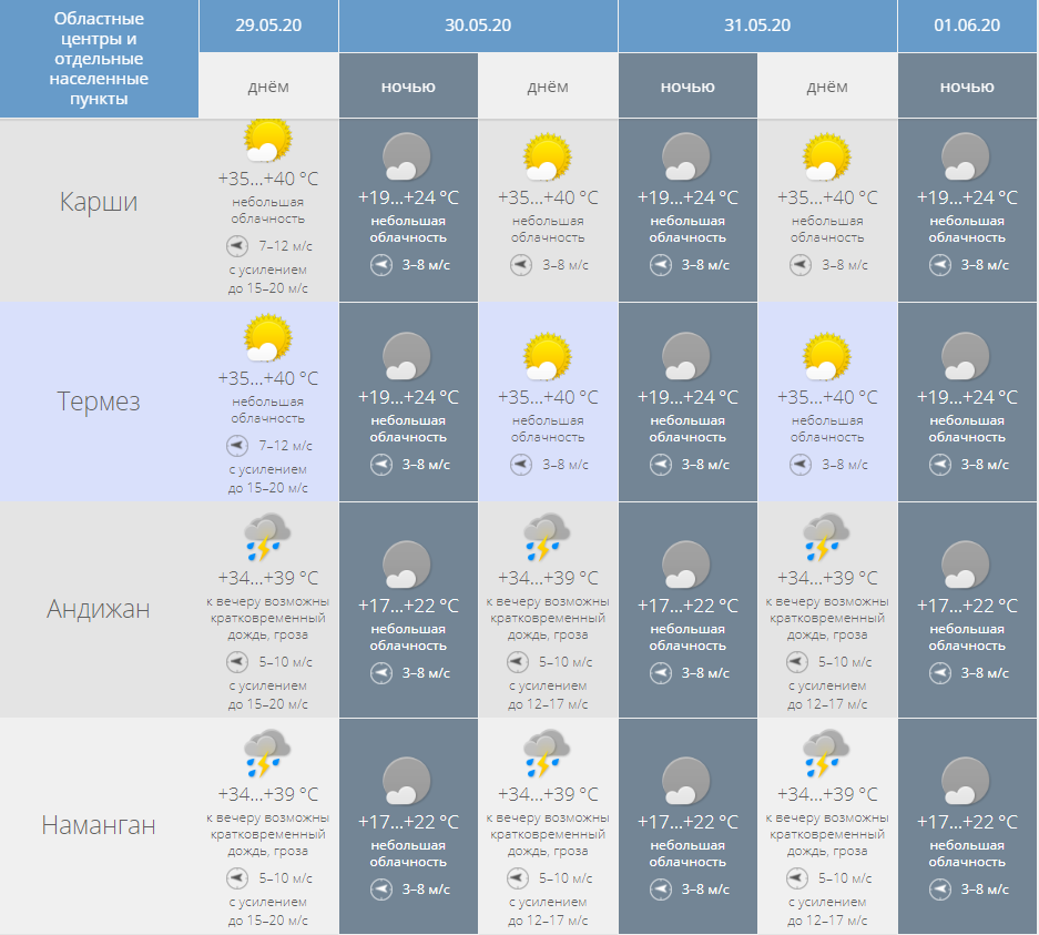 В Кашкадарьинской и Сурхандарьинской областях небольшая, местами переменная облачность, без осадков. Ветер восточный 7-12 м/с, местами возможно усиление до 17-22 м/с. Температура ночью 19-24 тепла, днем 35-40 тепла. В Андижанской, Наманганской и Ферганской областях небольшая, местами переменная облачность, к вечеру местами возможен кратковременный дождь, гроза. Ветер восточный 7-12 м/с, местами возможно усиление до 17-22 м/с. Температура ночью 17-22 тепла, днем 34-39 тепла.