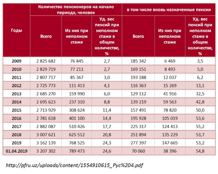 Как будто бы огромное число пенсионеров… По сообщению внебюджетного Пенсионного фонда при Министерстве финансов «начиная с 2016 года, в Республике Узбекистан наблюдается рост количества ежегодных обращений за назначением пенсий (ежегодный средний рост – 16 тысяч граждан), и к 2025 году превысит уровень 300 тысяч. Основной рост обращений за назначением пенсий по возрасту обусловлен достижением граждан, родившихся в период высокого уровня рождаемости («Беби-бум» 50-60-х годов), общеустановленного пенсионного возраста».