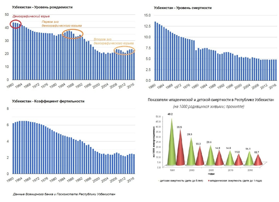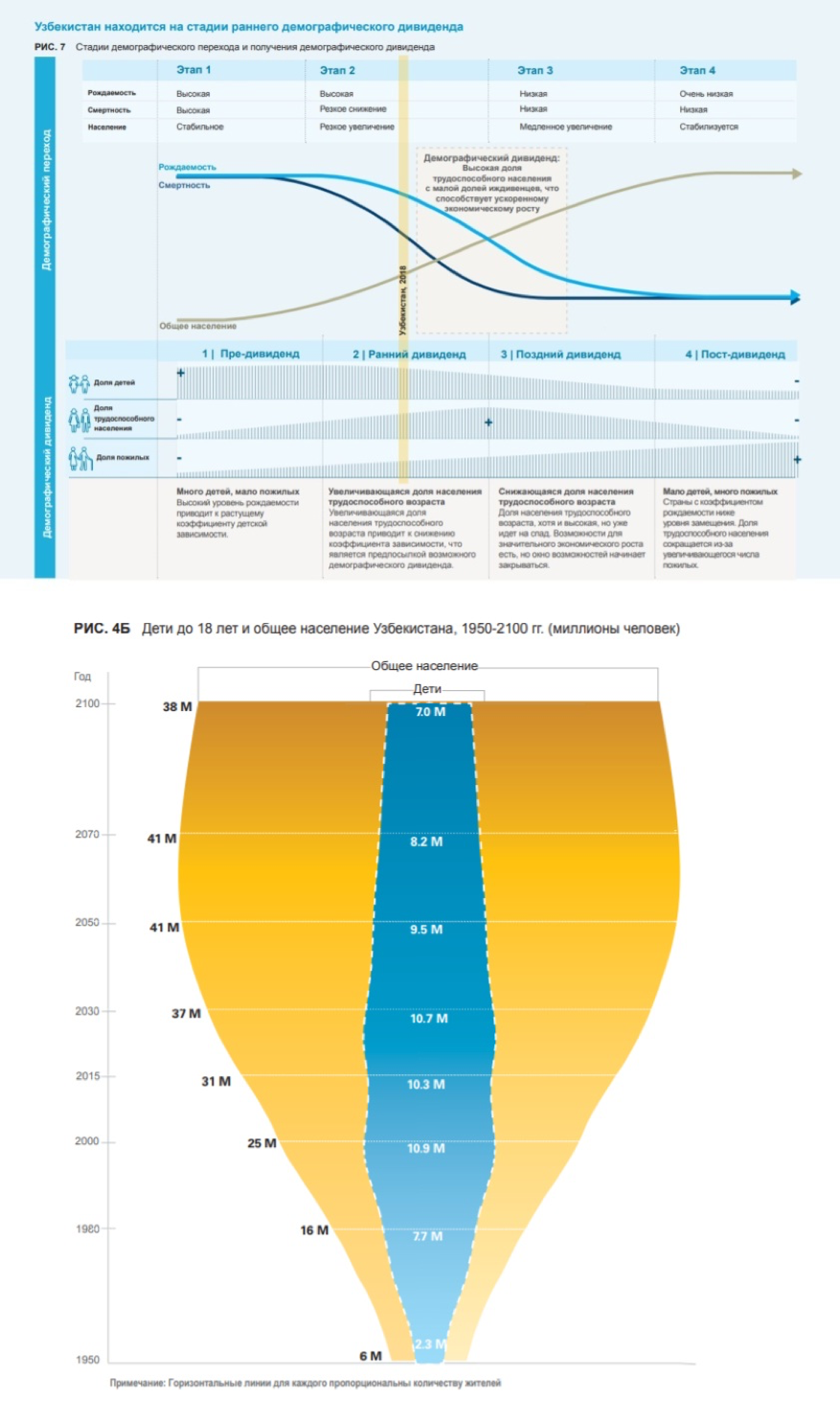 В исследовании ЮНИСЕФ «Поколение - 2030. Узбекистан» наша страна находится на этапе, который классифицируется как «ранний демографический дивиденд» (возможность экономического роста в связи с благоприятными демографическими условиями из-за роста доли трудоспособного населения и умеренного количества иждивенцев).