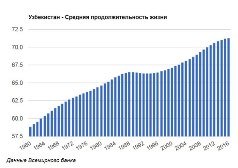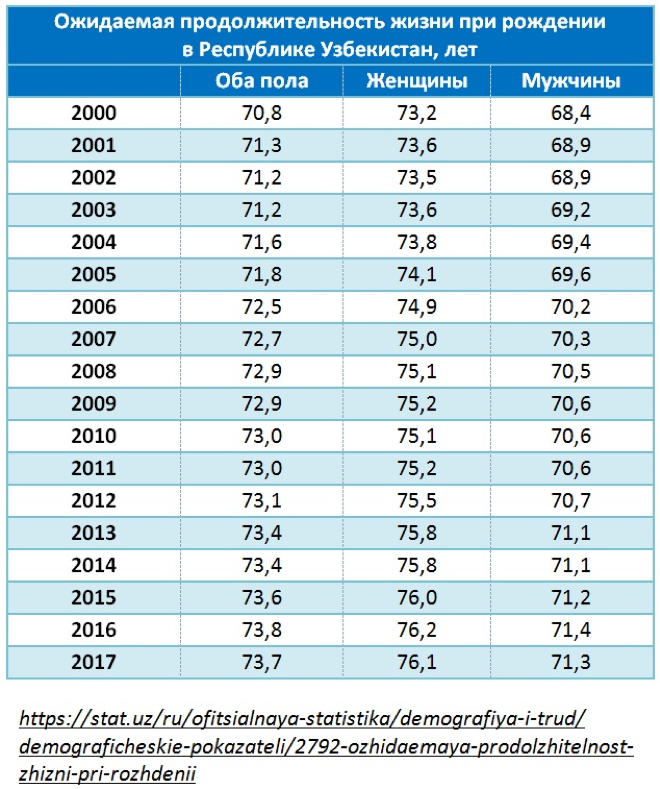 Или, другими словами, говоря о том, что в 2017 году средняя ожидаемая продолжительность жизни составляет в Узбекистане 73,7 года, то это совсем не означает, что до этого возраста доживут все поколения. Этот показатель рассчитывается для определения продолжительности предстоящей жизни новорожденных (ожидаемой продолжительность жизни при рождении), то есть 73,7 года – это средняя предполагаемая продолжительность жизни родившихся в 2017 году.