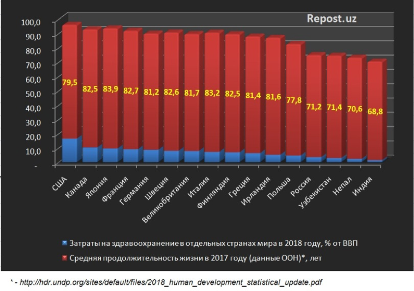 Так, в США затраты на здравоохранение достигают 16,4% от объема валового внутреннего продукта (продолжительность жизни 79,5 года), в Канаде, соответственно, 10,2% и 82,5 года, в Японии – 9,5% и 83,9 года, в Узбекистане – 2,9% и 71,4 года, в Индии – 1,4% и 68,8 года.