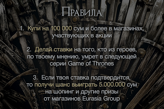 Сеть европейских франчайзинговых магазинов Eurasia Group запускает супер акцию, посвященную одному из культовых сериалов современности «Игра Престолов» в ТРЦ Samarqand Darvoza.