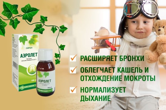 Сироп Аэролет рекомендуется для лечения сухого и влажного кашля у младенцев. Он содержит только натуральные ингредиенты на основе экстракта листьев плюща. Помимо отхаркивающего действия препарат Аэролет имеет бронхорасширяющий и противовоспалительный эффекты, которые имеют важное значение при лечении заболеваний, сопровождающихся бронхообструкцией.