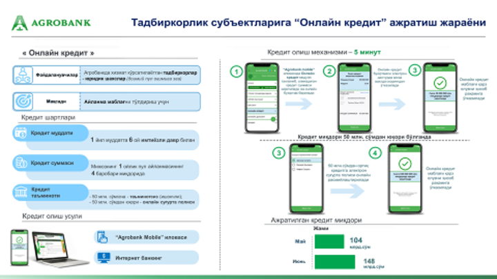 Для юридических лиц, Агробанк предоставляет онлайн кредит, который является уникальной услугой в стране на сегодняшний день. Чтобы воспользоваться онлайн кредитом клиенту необходимо подать заявку в мобильном приложении «Agrobank Mobile» и в системе «Интернет-банкинг». И всего за несколько минут возможно оформить и перечислить кредитные средства на свой расчетный счет.