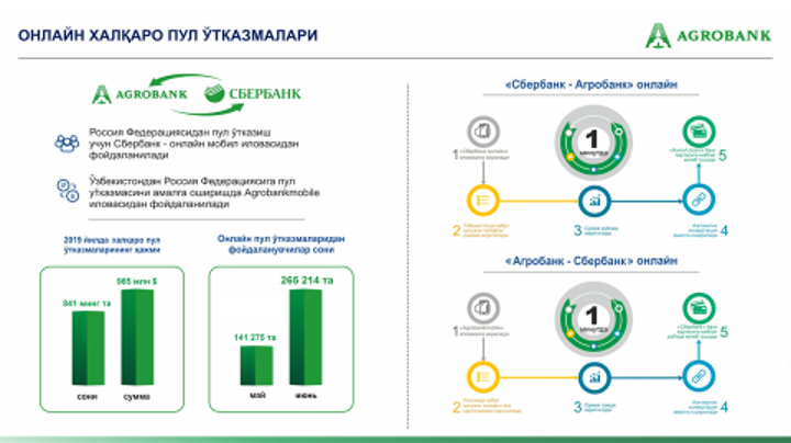 Кроме того, в мобильном приложении «Agrobank Mobile» можно осуществлять международные денежные переводы.. Из Узбекистана можно перевести средства напрямую с пластиковых карт Uzcard и Humo на пластиковые карты Сбербанка Российской Федерации и наоборот через мобильное приложение “Sberbank Online” на сумовые пластиковые карты Агробанка. Согласно информации банка, на сегодняшний день более 241 000 клиентов воспользовались данной услугой, а общая сумма транкзакций составила 115 млрд. сумов.