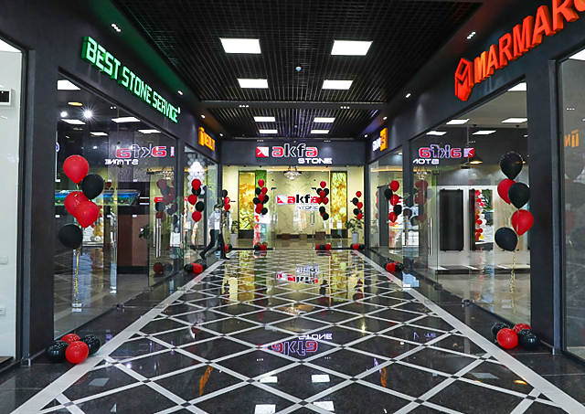На 95 кв.м. торгового комплекса расположился шоу-рум AKFA STONE, специализирующийся на производстве натурального гранита. Такой камень как гранит является одним из самых крепких и надежных материалов, имея при этом красивый внешний вид и эстетичность.