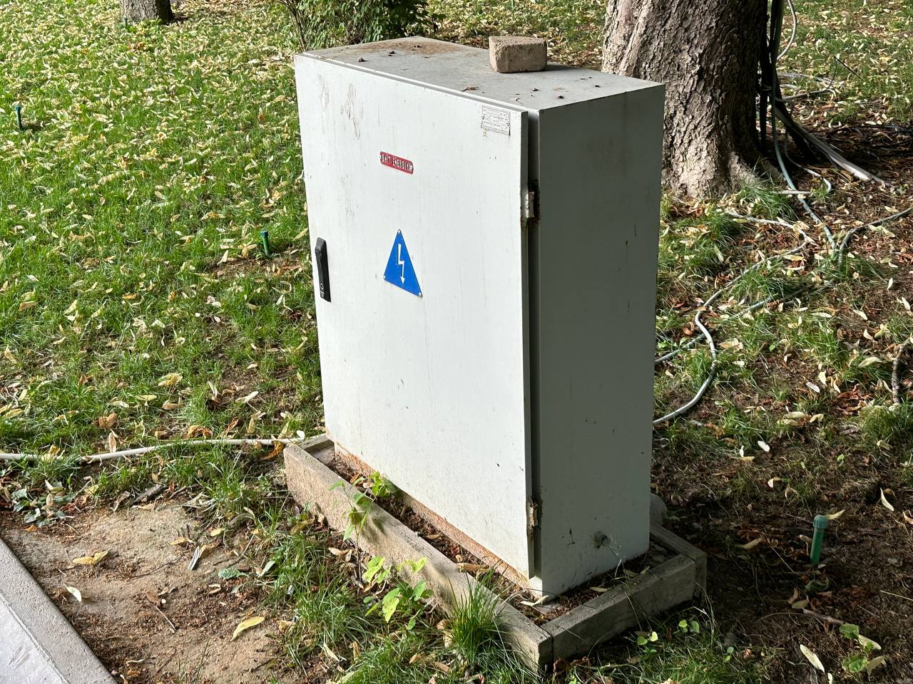 У меня конечно возникает вопрос. Я очень хорошо разбираюсь в безопасности, и так же хочу сказать, в данном щите проходит напряжение в 380 W и выше. Кабеля брошены прям по аллее, по нему ездят и самакатчики, и велосипедисты, и женщины с колясками. Данный провод даже не защищен защитным корбом. Вокруг дерева так же лежат провода разбросаны на лево на право. Не дай бог кого зажарит, детей, животных а то и взрослых.