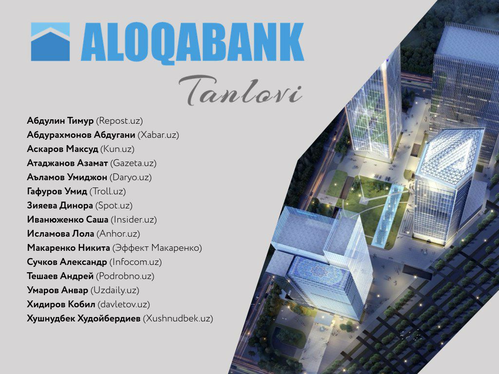 Призёры первой премии Aloqabank Tanlovi: Абдулин Тимур (Repost.uz), Абдурахмонов Абдугани (Xabar.uz), Аскаров Максуд (Kun.uz), Атаджанов Азамат (Gazeta.uz), Аъламов Умиджон (Daryo.uz), Гафуров Умид (Troll.uz), Зияева Динора (Spot.uz), Иванюженко Саша (Insider.uz), Исламова Лола (Anhor.uz), Макаренко Никита (Эффект Макаренко), Сучков Александр (Infocom.uz), Тешаев Андрей (Podrobno.uz), Умаров Анвар (Uzdaily.uz), Хидиров Кобил (davletovuz) и Хушнудбек Худойбердиев (Xushnudbek.uz).
