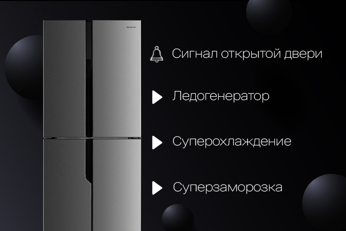 Новый холодильник Avalon оснащен сенсорным дисплеем. Там же Вы можете посмотреть установленный режим и температуру. Холодильник имеет несколько режимов охлаждения. Если вам нужно срочно охладить напитки, например к приходу гостей, Вы можете воспользоваться функцией суперохлаждения. Так же имеется режим суперзаморозки продуктов в морозильной камере. Кроме того, в жаркие дни Вы можете воспользоваться ледогенератором. Еще одной приятной функцией является сигнал открытой двери Alarm. Если вдруг Вы забыли закрыть дверь, холодильник подаст сигнал и предотвратит снижение эффективности охлаждения.