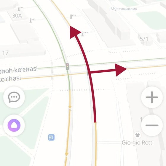 Если брать участок дороги от Ц1 в сторону здания «Тошшахартрансхизмат», то он имеет три полосы для движения, где с первой следует повернуть направо, со второй и третьей — прямо. Налево поворачивать не разрешается.