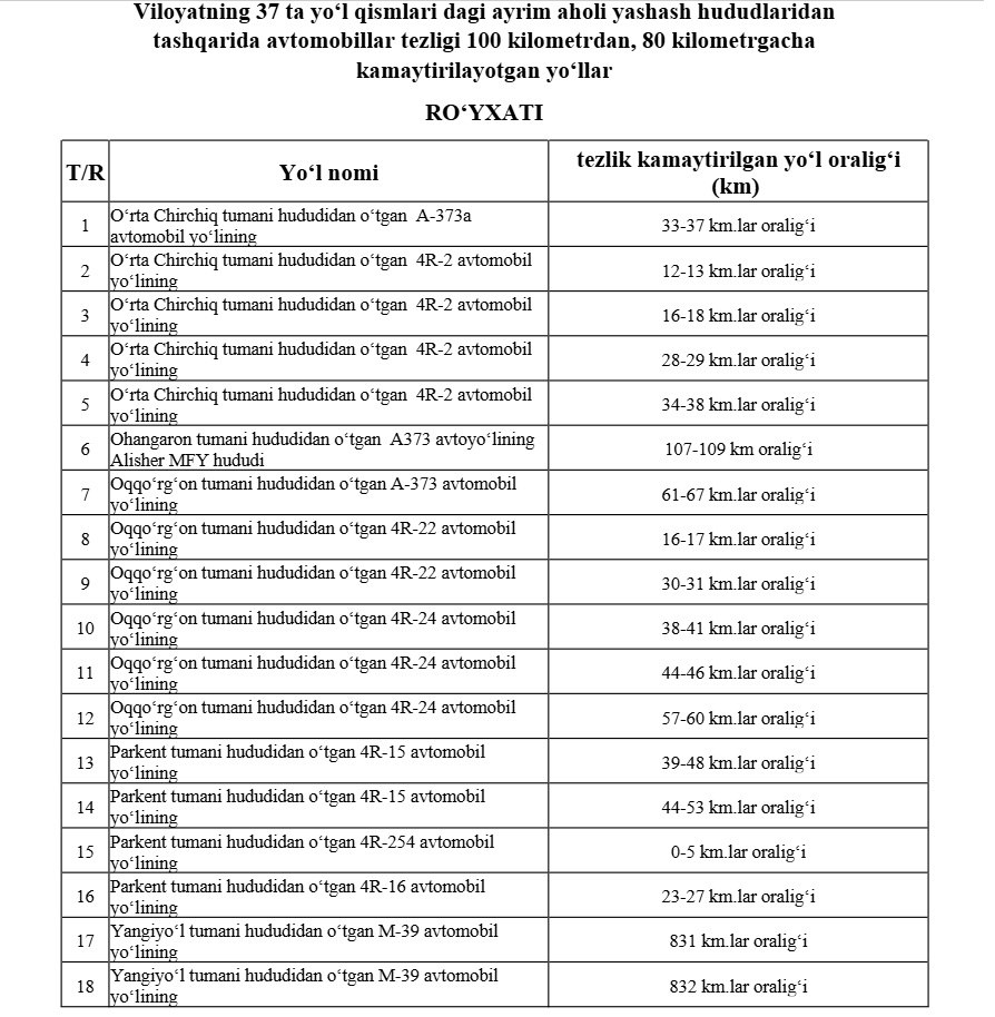 В Ташкентской области на 37 участках дорог вне населенных пунктов допустимую скорость движения автомобилей снизили со 100 до 80 км/ч. Об этом говорится в решении хокима области.