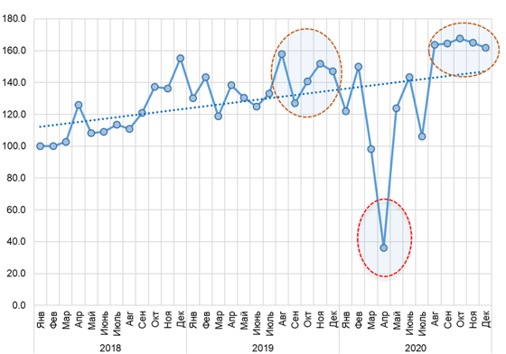 А в сентябре продажи выросли на 0,5% по сравнению с предыдущим месяцем (на 29,5% по сравнению с сентябрем 2019 года), в октябре рост составил два процента к сентябрю (19,2% по сравнению с октябрем 2019-го).