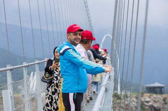 Первым пунктом увлекательной программы стало посещение впечатляющего стеклянного подвесного моста, открывшегося в декабре 2023 года. Его длина составляет внушительные 305 метров, а высота достигает 150 метров. Мост способен выдержать одновременно до 600 человек, обеспечивая безопасность и комфорт посетителей. Автовладельцы Tiggo 7 Pro с восторгом делились эмоциями, наслаждаясь головокружительным видом с высоты. Прогулка по стеклянному подвесному мосту подарила им незабываемые впечатления и яркие воспоминания.