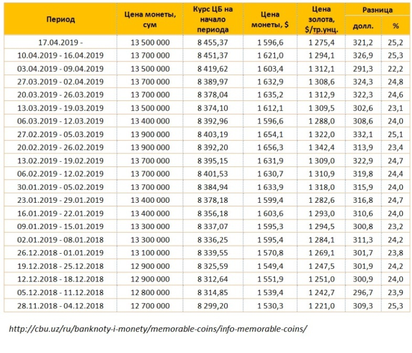 «В целях расширения возможностей населения по инвестированию и сбережению, а также развития рынка драгоценных металлов, с учетом международного опыта и практики, Центральный банк Республики Узбекистан в качестве пилотного проекта выпускает в обращение памятные монеты из золота…» с 28 ноября прошлого года. Монеты изготовлены из золота пробы 999,9 и имеют вес 31,1 грамма – идеальная проба и вес для сравнения: все параметры соответствуют стандарту продаваемой тройской унции золота на международных биржах.