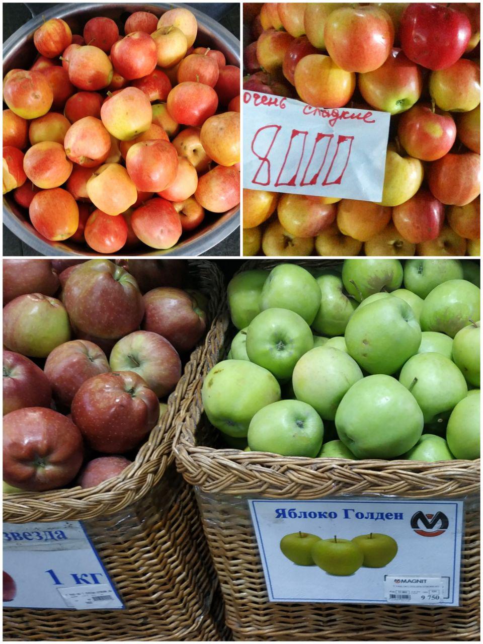 Цена яблок на базаре не превышает десяти тысяч сумов. В корзине гипермаркета она не доходит до этой суммы. Максимальная цена – 9 600 сумов. Что касается продуктов, которые продаются «на земле», то, к удивлению, цена их такая же как в официальных арендованных местах базара.