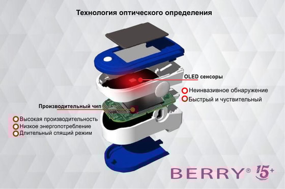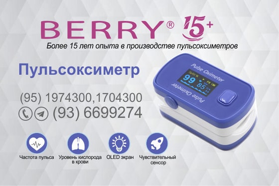 Пульсоксиметр от компании «BERRY» простой в использовании, сегодня является незаменимым прибором для каждого. Осуществляя, как однократные измерения, так и длительный мониторинг (постоянный контроль) уровня кислорода и частоты сердцебиения. Для исследования не надо брать кровь из артерии, как делалось ранее. Имеет периферический датчик, микропроцессор и дисплей, на который выводится информация, его частота и показатель уровня кислорода в крови (сатурации). Практически все аппараты оснащены звуковым сигналом.
