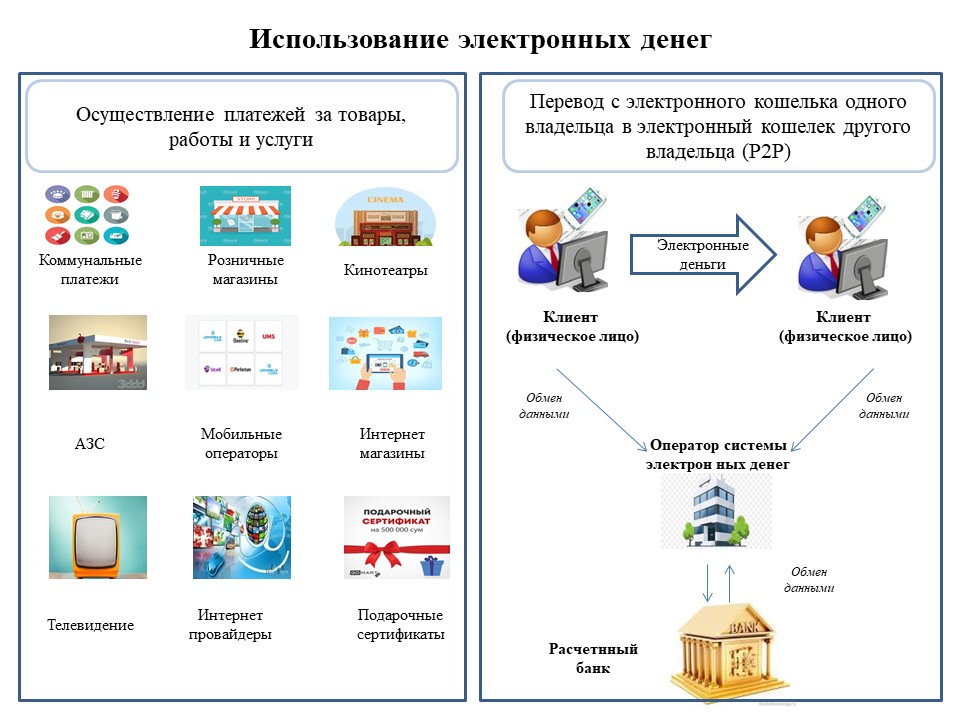 Согласно правилам, электронные деньги используются их владельцем - физическим лицом, в целях осуществления платежей и иных операций на условиях, определенных правилами системы электронных денег и не противоречащих законодательству Узбекистана, путем передачи электронных денег от владельца другому участнику системы электронных денег.