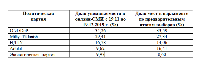 Напомним, что 20 декабря на сайте Repost.uz был опубликован аналитический материал, в котором эксперты Ledokol Group и Unique PR на основе данных системы анализа и мониторинга Digital Analytics раскрыли количественные и качественные показатели упоминаемости политических партий в онлайн-СМИ и социальных сетях в последний месяц перед голосованием. После оглашения предварительных итогов выборов в Законодательную палату Олий Мажлиса они были сверены с ранее обнародованными индексами упоминаемости в СМИ.