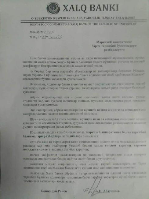 Сообщается, что результате был проведен ряд мероприятий, где сотрудники должны были сбросить вес. Отмечается, что документ был отправлен во все филиалы банка. На фото видно, что документ заверен подписью председателя правления А. Н. Абдуллаева.