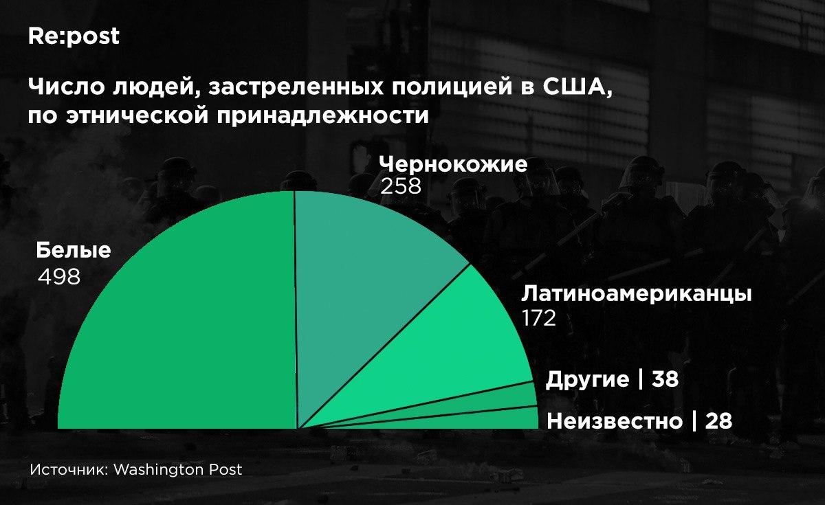 Washington Post опубликовало данные о расовой принадлежности убитых полицией людей. Выяснилось, что половина из них - белые, другая половина - представители нацменьшинств. Но если делать поправку на процентное соотношение, то получится, что представителей небелой части населения США погибает больше.