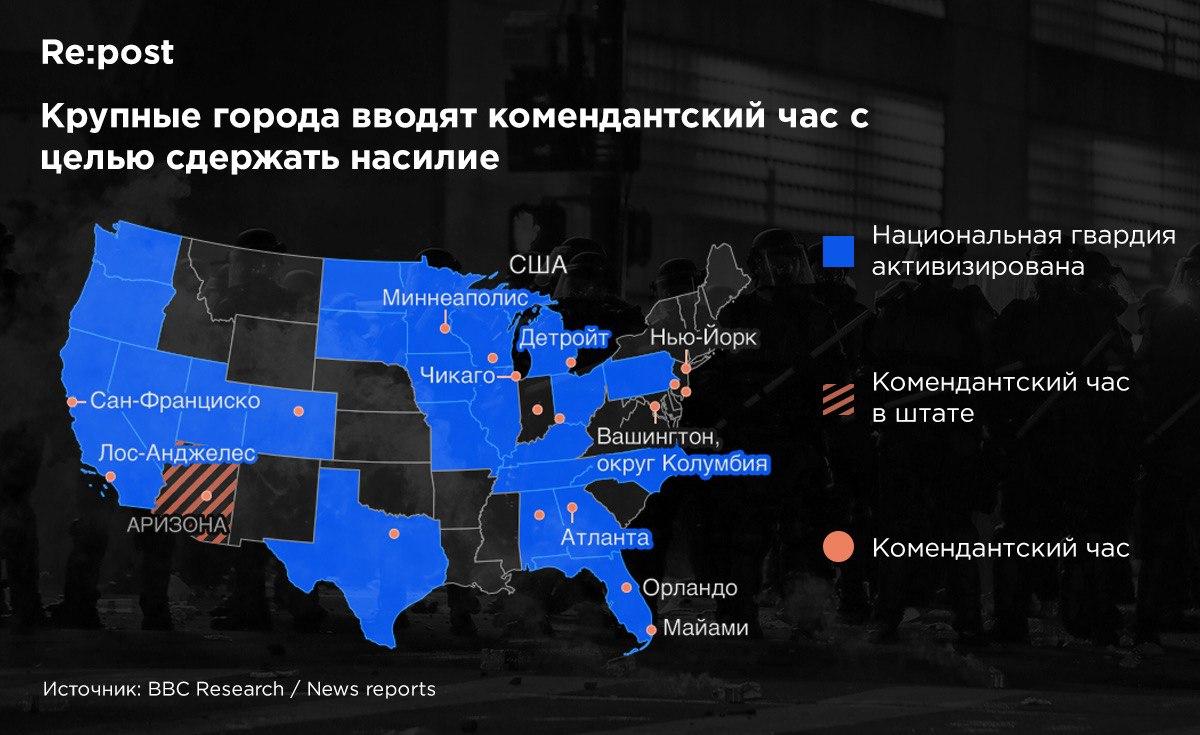 Мирные митинги прошли практически по всей Америке, в том числе затронули Европу и даже Россию. Но ситуация изменилась, начались массовые беспорядки, грабежи и драки. Крупные города стали вводить комендантские часы во избежание насилия.