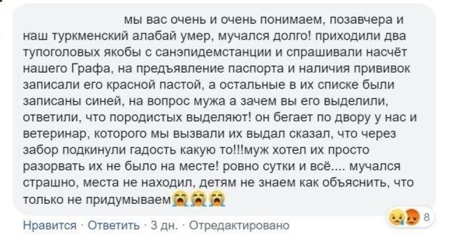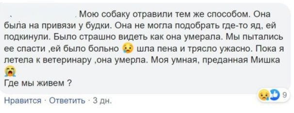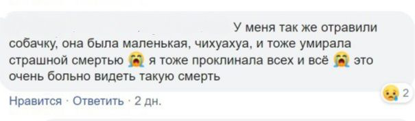 Они убили мою любимицу, которая им ничего не сделала. Брат рассказывает, что она бегала по дому, не находила себе место от боли. Подкинули нам яд примерно в 11:30, а собака умерла в 18:00. Она тряслась в судорогах и упала замертво, как каменная. Мы не могли ее разогнуть. Не понимаю чем ее отравили. Ее рвало, весь рот был в пене. 2 сентября я потеряла своего котенка. Кошка кричала на весь дом, даже соседи приходили. На моих руках умирали моя собака и кошка.
