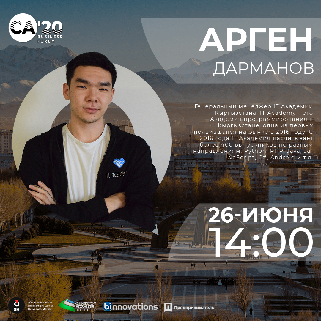 В дискуссии примут участие такие представители бизнес среды Центральной Азии как Хикмат Абдурахмонов (Humo Partners), братья Мамасаидовы (Mfaktor), Денис Гайворонский (Куликовский Кондитерский Дом), Дарья Суходолова (со-организатор Red Jolbors), Чубак Темиров (Парк Высоких Технологий Кыргызстана), Амирхан Омаров (BI Innovations) и многие другие.
