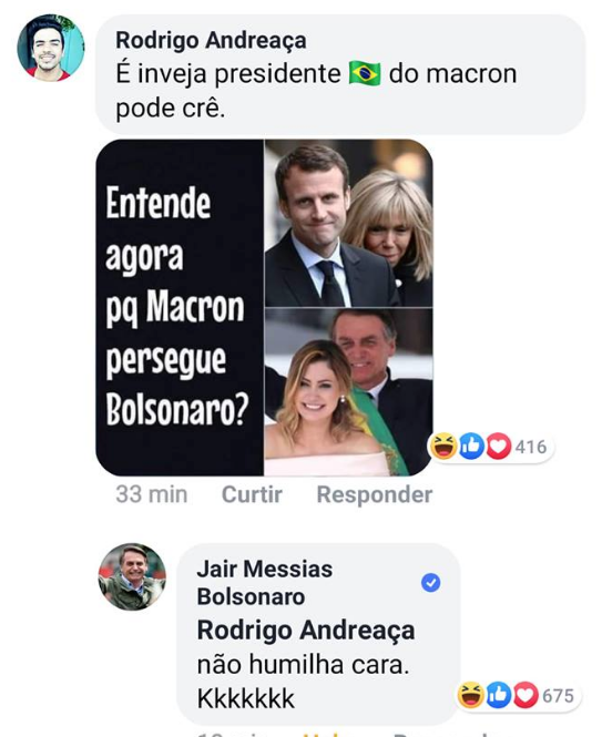 Картинка была подписана: «Теперь понятно, почему Макрон преследует Болсонару». От себя Андреас, отметив президента Бразилии, написал: «Президент, Макрон вам просто завидует». Болсонару ответил: «Не унижай парня, лол».