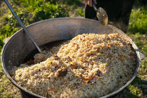 Естественно, грандиозное событие встречи — открытие казана с сумаляком. Каждый присутствующий гость забрал с собой баночку этого праздничного лакомства. А какое же значимое мероприятие проходит без главного узбекского блюда? Каждый гость получил возможность отведать тарелку праздничного плова.