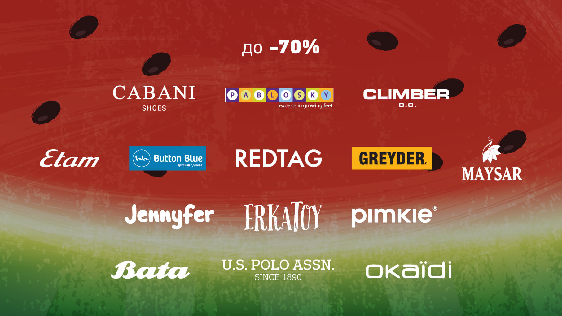 - Erkatoy, Avva, D'S Damat, Maysar, Vicco, Still young, Cabani, Button Bluе, , US POLO, Jennyfer, Pimkie, Bata, Okaidi, Greyder, Colin's – до 70%