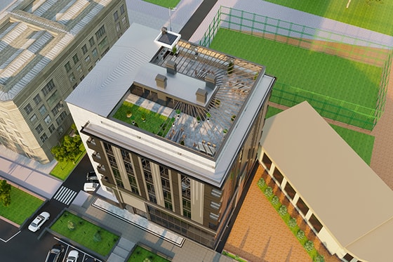 - эксплуатируемая кровля с благоустроенной зоной отдыха на открытом воздухе и круглогодичным зимним садом и кафе;