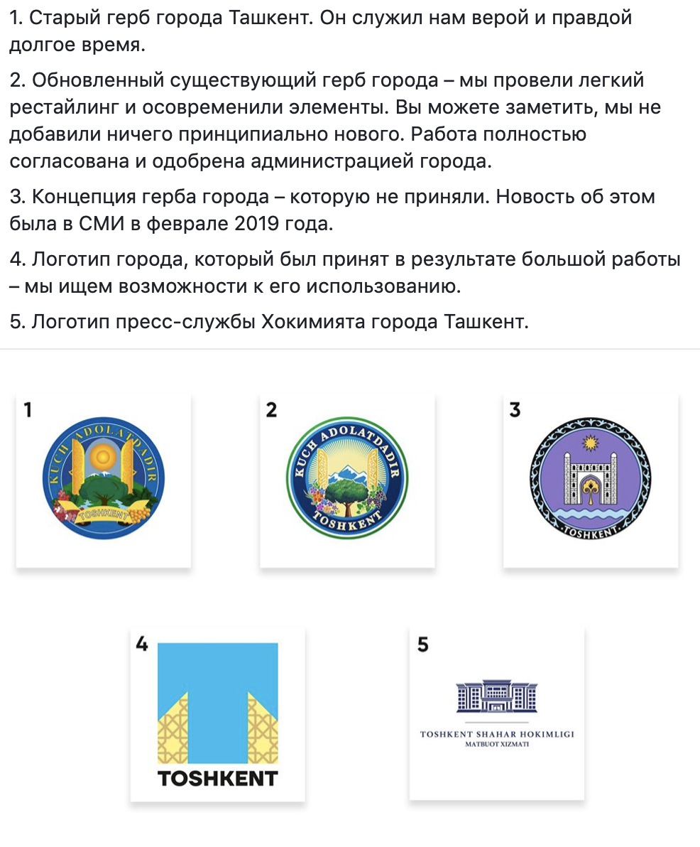 Хокимият города Ташкента сообщил о проведении легкого рестайлинга существующего герба города. Об этом говорится на странице ведомства в Facebook. По словам администрации, в существующий герб города не было добавлено ничего принципиального нового, а работа была согласована и одобрена администрацией города.