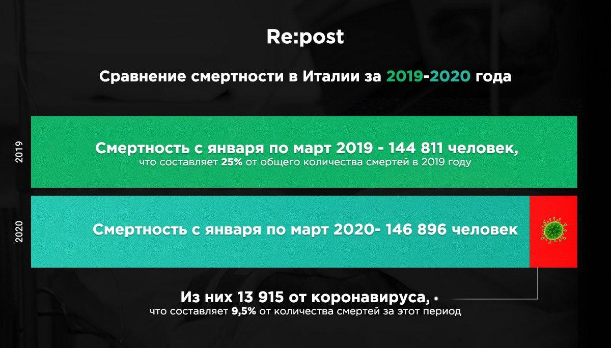 Repost решил разобрать и сравнить данные смертности в Италии за три месяца в 2019 и 2020 годах, чтобы понять, на самом ли деле смертность является рекордной.