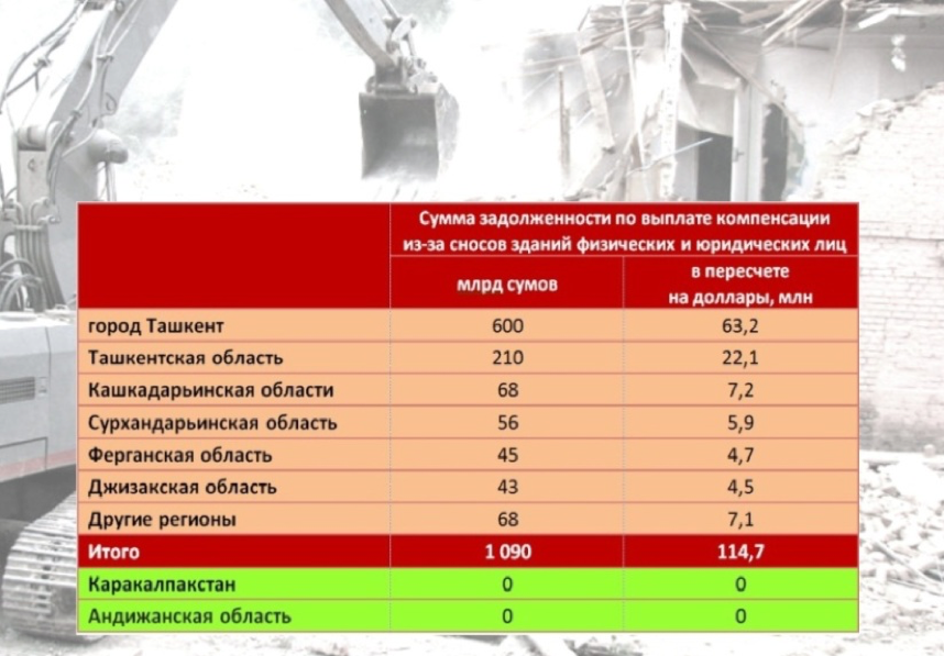 21 ноября 2019 года на заседании Законодательной палаты Олий Мажлиса были озвучены данные о задолженности по выплате компенсации из-за отчуждения имущества юридических и физических лиц. В результате инвентаризации эта сумма составила 1,1 трлн сумов или 114,7 млн долларов.