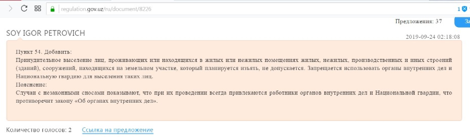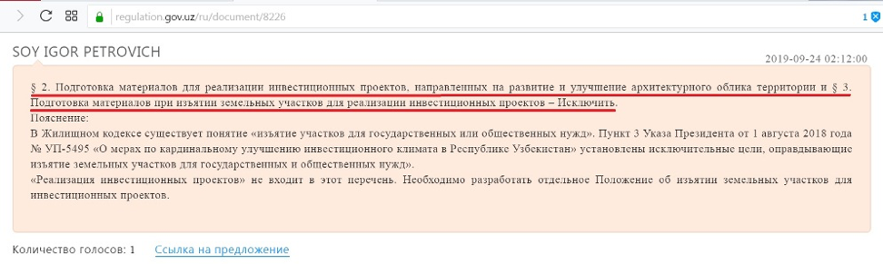 «Изъятие земельных участков для реализации инвестиционных проектов» - это положение, противоречащее Жилищному и Земельному кодексам, а также указу президента от 1 августа 2018 года «О мерах по кардинальному улучшению инвестиционного климата в Республике Узбекистан».