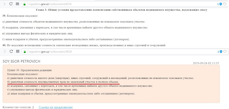 Да, «Положением» установлено, что перед планируемым изъятием проводится открытое обсуждение вопроса с участием инициаторов, собственников и средств массовой информации. Но указом президента «О мерах по кардинальному улучшению инвестиционного климата в Республике Узбекистан» от 1 августа 2018 года также было определено, что с 1 сентября 2018 года: «принятие решений об изъятии земельных участков для государственных и общественных нужд допускается исключительно после проведения открытого обсуждения с заинтересованными лицами, земельные участки которых планируется изымать, а также оценки выгод и издержек».