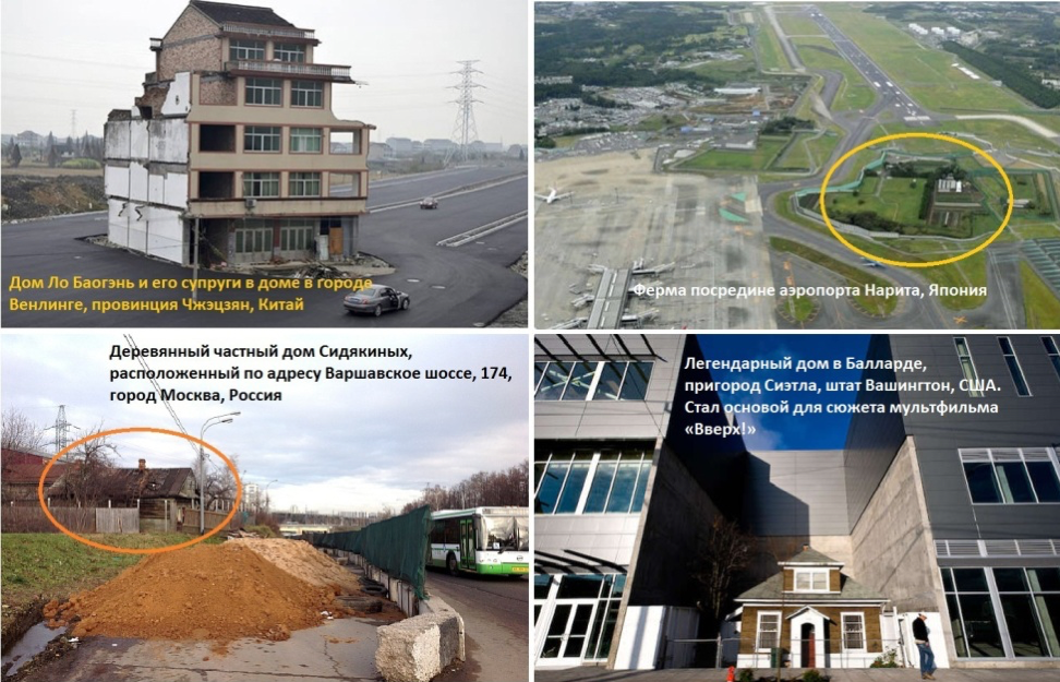 Посмотрите на приведенные фотографии. На них изображены примеры домов и сооружений в Китае, Японии, России и США, с владельцами которых в ходе реконструкции или нового строительства власти не смогли договориться о размере компенсации или собственники просто не захотели переезжать.