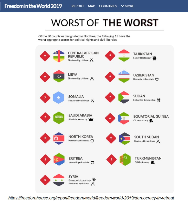 Вот данные состояние свободы в мире (Freedom in the World), приведенные в ежегодном исследовании о состоянии политических и гражданских свобод в странах мира, который выпускается международной неправительственной организацией Freedom House.