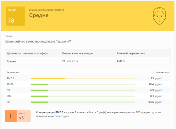 В 09:00 станция мониторинга в столице Узбекистана показывала результат в 78 AQI. Концентрация PM2.5 — в 5 раз выше рекомендуемого ВОЗ среднегодового значения качества воздуха.