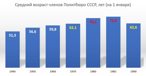 Средний возраст представителей власти в СССР постоянно возрастал. Вот данные об его уровне среди членов Политбюро по состоянию на 1 января соответствующего года.
