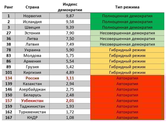 Россия раньше занимала место в группе стран с гибридным режимом. Но вот уже несколько лет РФ закрепилась в группе стран с авторитарным режимом (автократии). К таким режимам относятся диктатуры и абсолютные монархии. Соседями России являются такие страны как Конго, Руанда и Зимбабве.