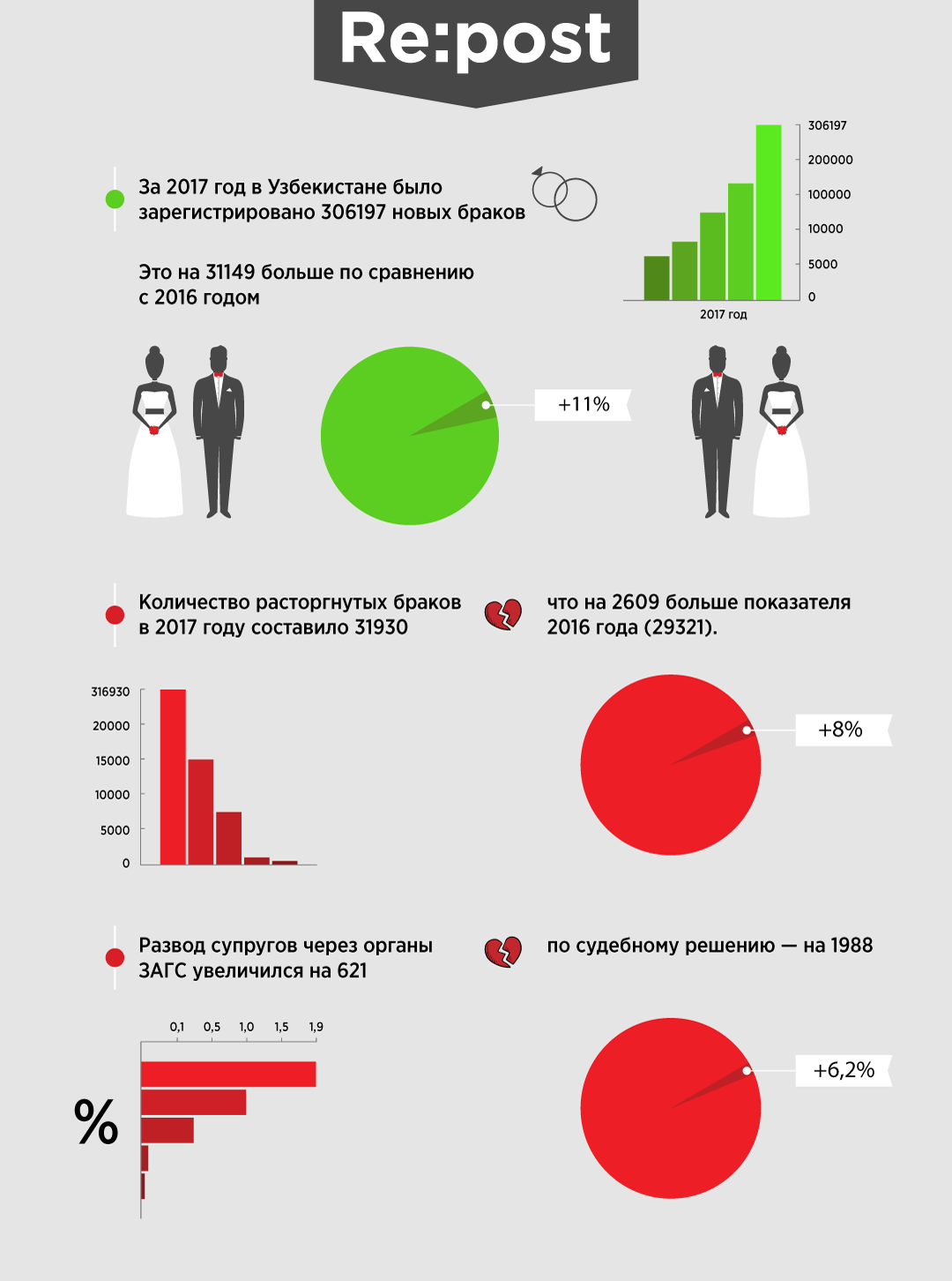 В попытках уменьшить число разводов в 2017 году был создан Совет свекровей, хоким Ташкента пытался инициировать публикацию в городских газетах фото разводящихся пар. Однако, несмотря на то, что в 2017 году удалось предотвратить развод 22 тысяч семей, число разводов в Узбекистане ежегодно растёт на 10-11%. Как Вы это можете прокомментировать?